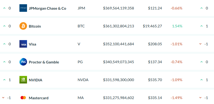 O valor de mercado do Bitcoin já supera o da Visa, Mastercard, Paypal, McDonalds e está próximo de ultrapassar o JPMorgan. Apesar de não ser uma medida ideal para comparar um ativo como o bitcoin com ações devido a sua natureza diferente, ele serve para mostrar o quão longe o BTC chegou.