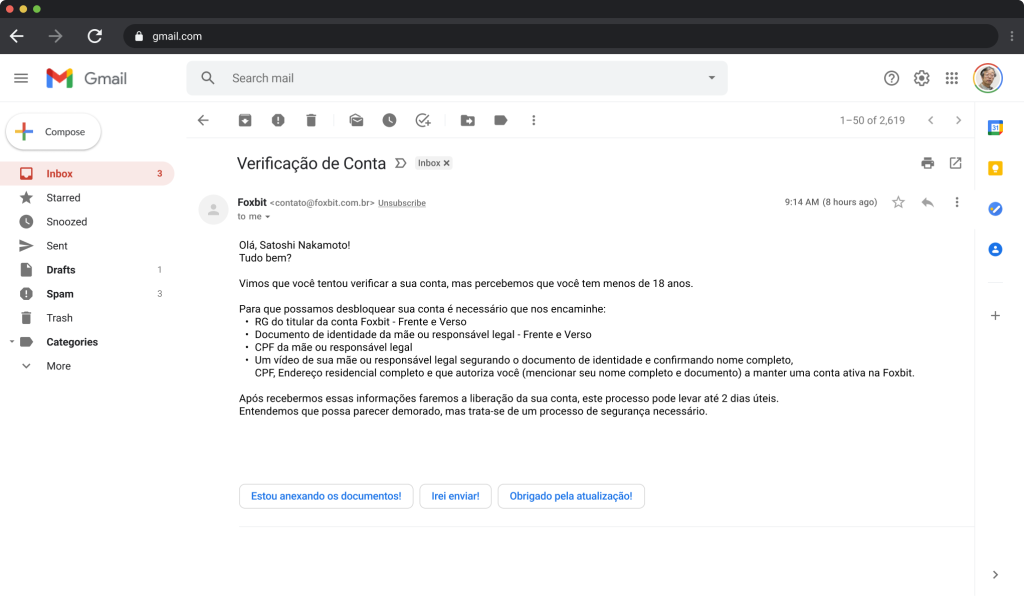 Após o envio da autorização, a Foxbit realiza a análise do documento e valida o cadastro do menor.